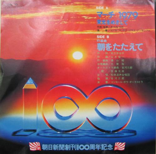 c/w:行進曲 朝をたたえて(足立百合子 作詞、山本新一 作曲、湯山昭 作・編曲、大栗裕 合唱編曲、岩河三郎 オーケストラ編曲、佐藤光政 歌、松原混声合唱団 合唱、岩河三郎 指揮、コンセール・ボウ・オーケストラ 演奏。 朝日新聞創刊100周年記念公募入選曲